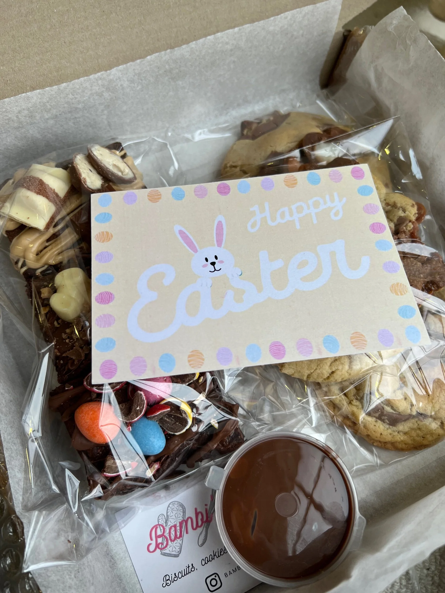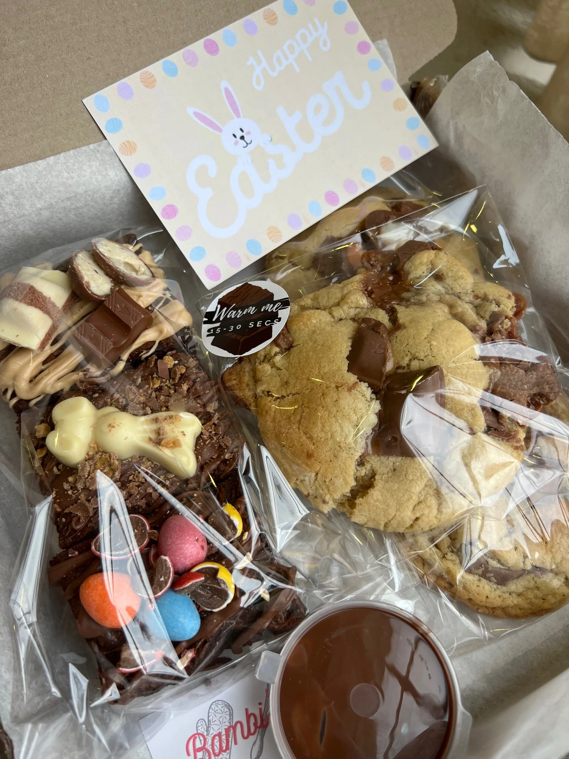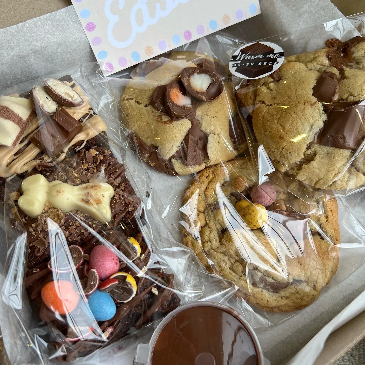 3 cookies loaded with chocolate and topped with spreads & 3 Belgian chocolate brownies topped with spreads chocolates 🍪🤎🍫 and with a dip too! ALL WILL BE EASTER FLAVOURS 🐣🐰🥕