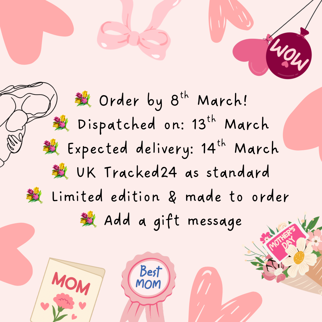 All orders are sent via Royal Mail Tracked 24 to UK addresses. Mother’s Day orders will be dispatched on 13th March, with expected delivery on 14th March.